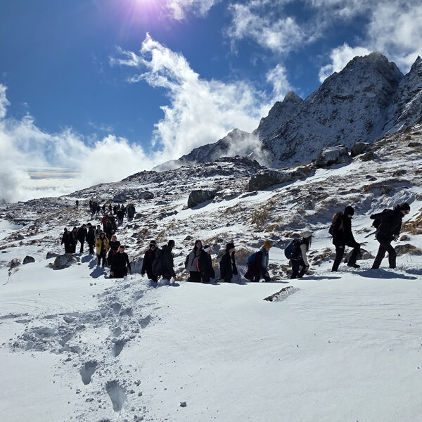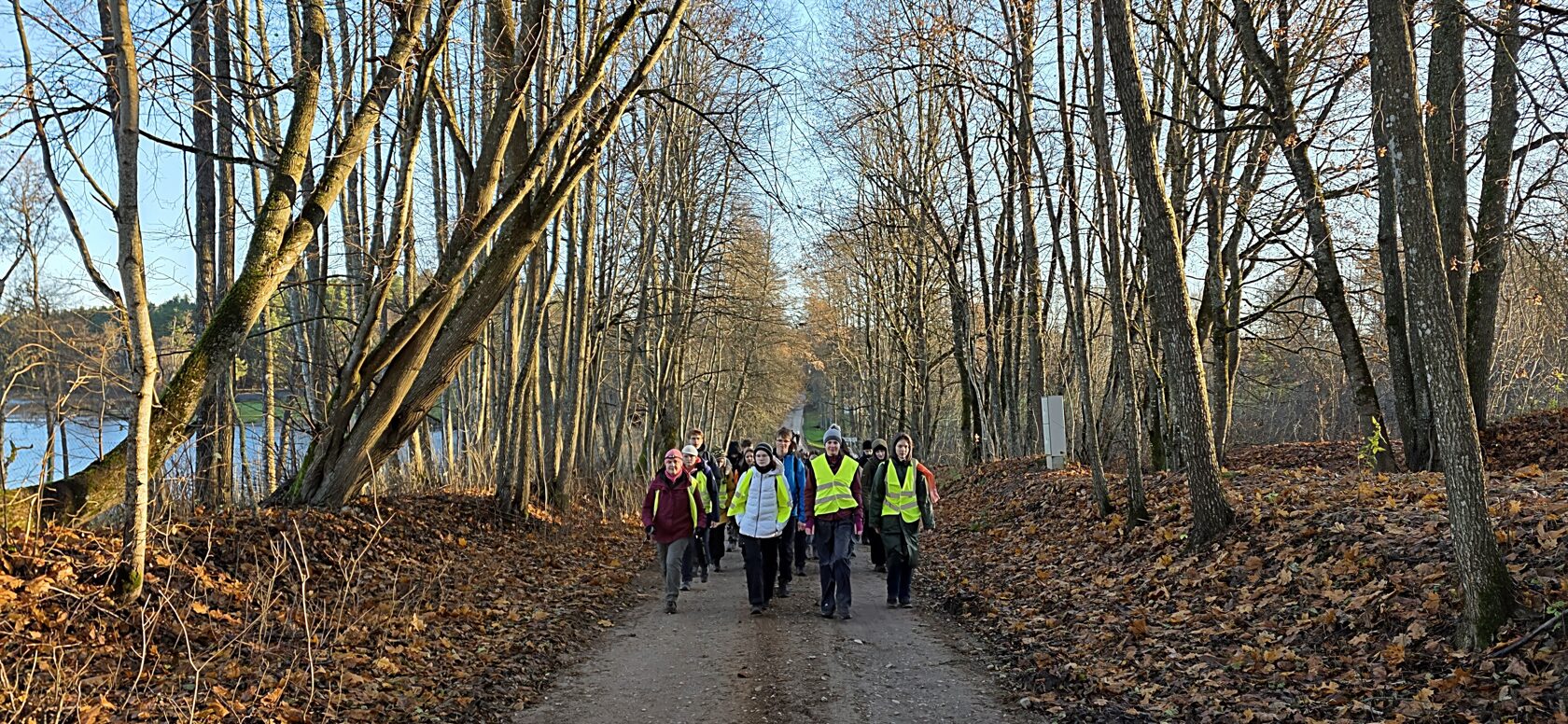 Galiausiai autobusas sustojo. Keliautojai kaipmat užsidėjo kuprines ant pečių, užsivarstė žygio batus ir išėjo į pirmąjį žygį – 5 kilometrų kelią- iki tarp kalnų prie ežero įsikūrusio viešbučio.